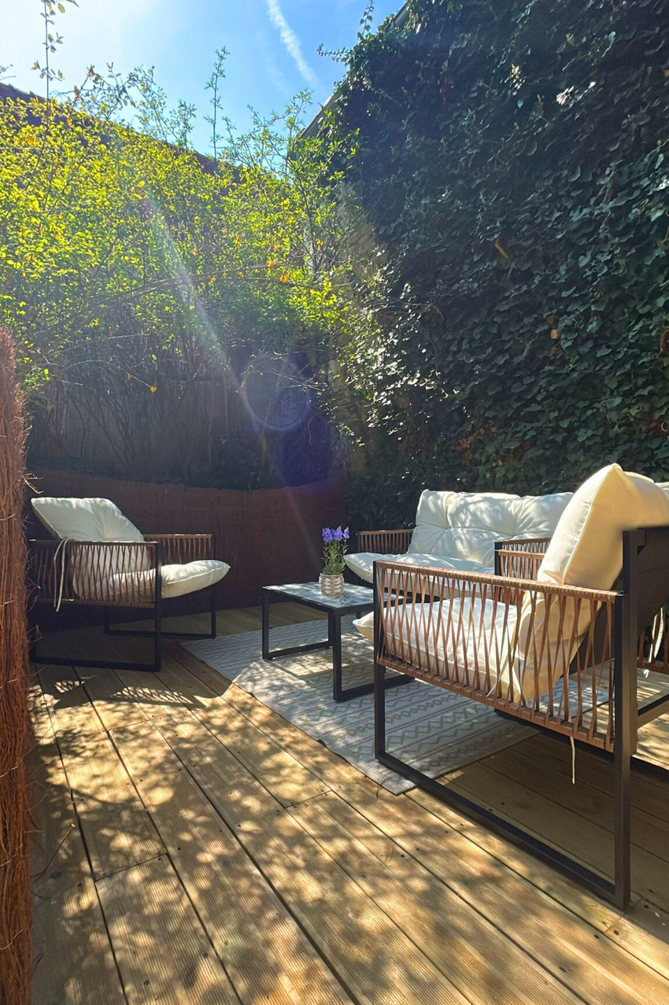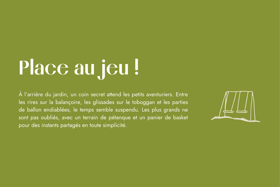 Situé au fond de la propriété, La Grange est un gîte spacieux et chaleureux, entièrement rénové dans un style loft avec pierres et poutres apparentes. Il offre un vaste jardin arboré de 800 m² privatif à l’arrière, parfait pour profiter des beaux jours en toute tranquillité. Le jardin est équipé de 4 grandes table en bois avec bancs, d’un barbecue, d'une terrasse et d'un jacuzzi et bénéficie d’un accès direct à l’aire de jeux de la commune – un vrai plus pour les familles avec enfants.